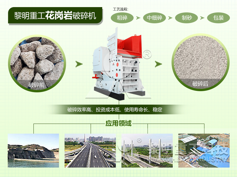 1.顎式破碎機:顎式破碎機是一種常見的破碎設備,適用于處理堅硬的巖石。它通過兩個顎板之間的擠壓力來破碎巖石,適合處理中小顆粒的花崗巖。